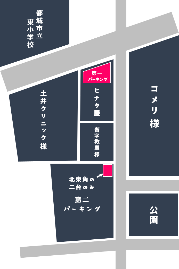 第2パーキングは、大きな駐車場の中から2台分のみを教室保護者様用として借りており、教室に一番近い北東角に駐車してください。
