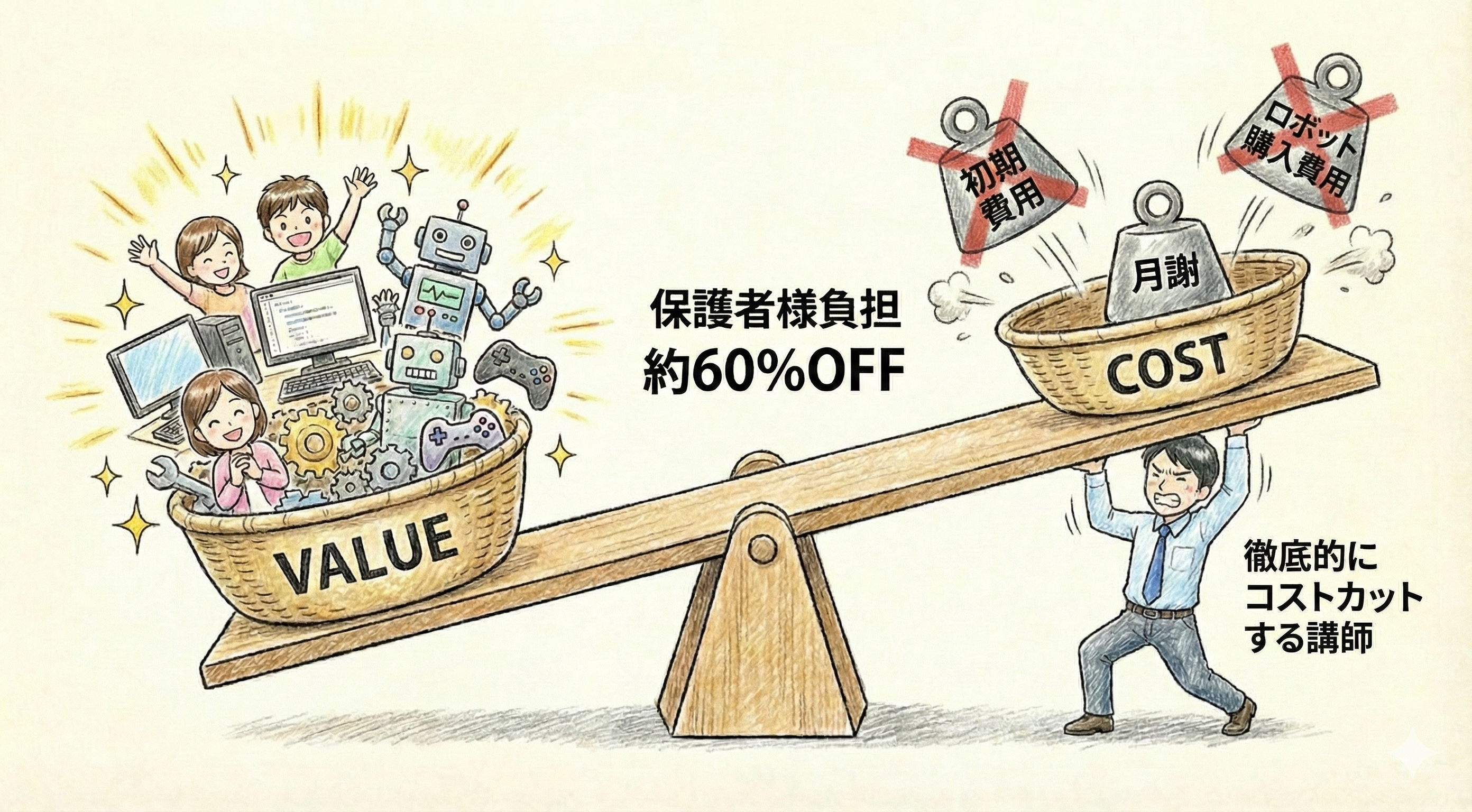授業の質を維持しながら、保護者様の費用負担は大手ロボット教室平均の約60%OFFです。