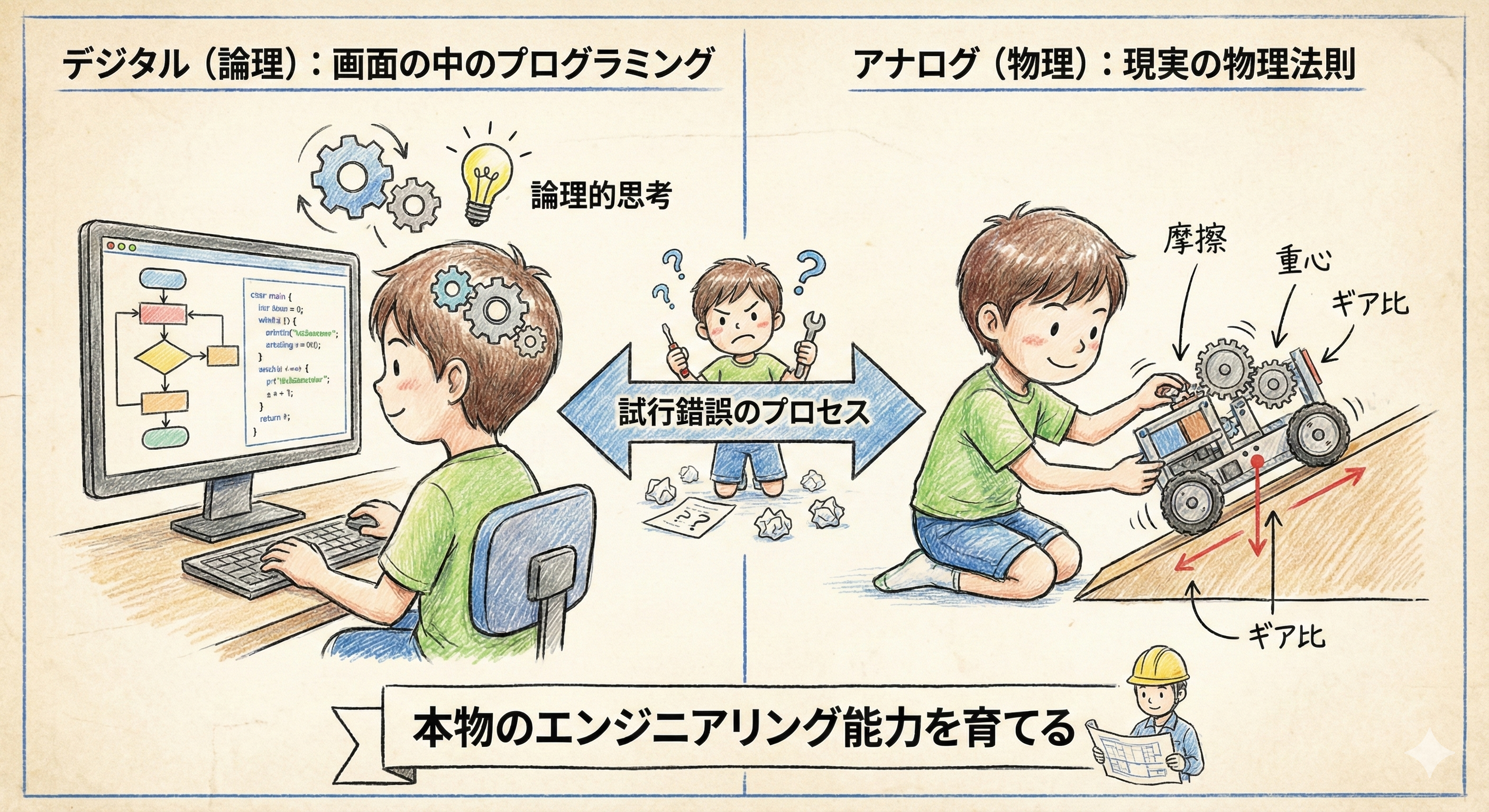 画面の中のプログラミングでは「論理的思考」が身に付きますが、ロボットプログラミングではさらに摩擦、重心、ギア比といった「現実の物理法則」を学びます。思い通りに動かないロボットを試行錯誤して動かす、その現実と向き合うプロセスこそが、本物のエンジニアリング能力を育てます。