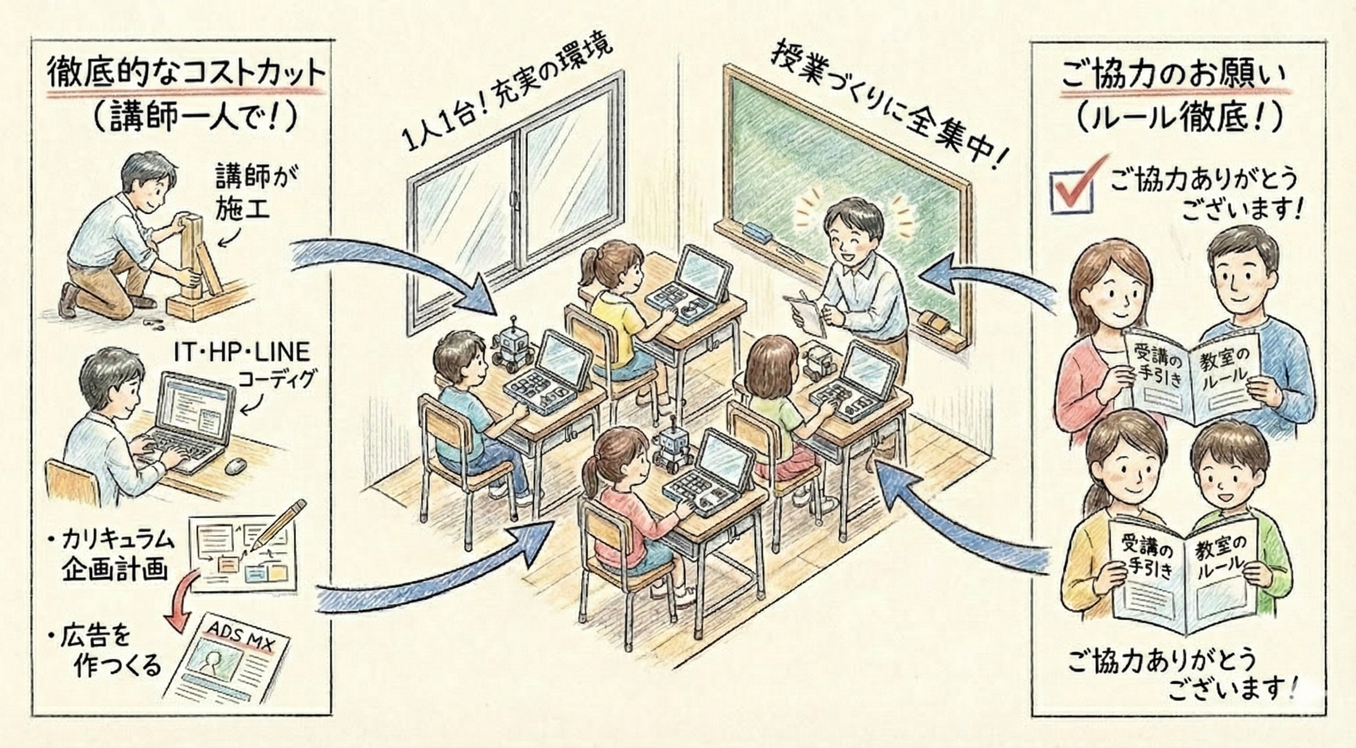 教室の施工からITシステム(HP・LINEボット・IoT)、授業カリキュラムの構築、広告の作成までをすべて講師一人で行うことで、外注費や人件費、広告費といったコストを徹底的にカット。ロボットなどの機材導入費に充てています。