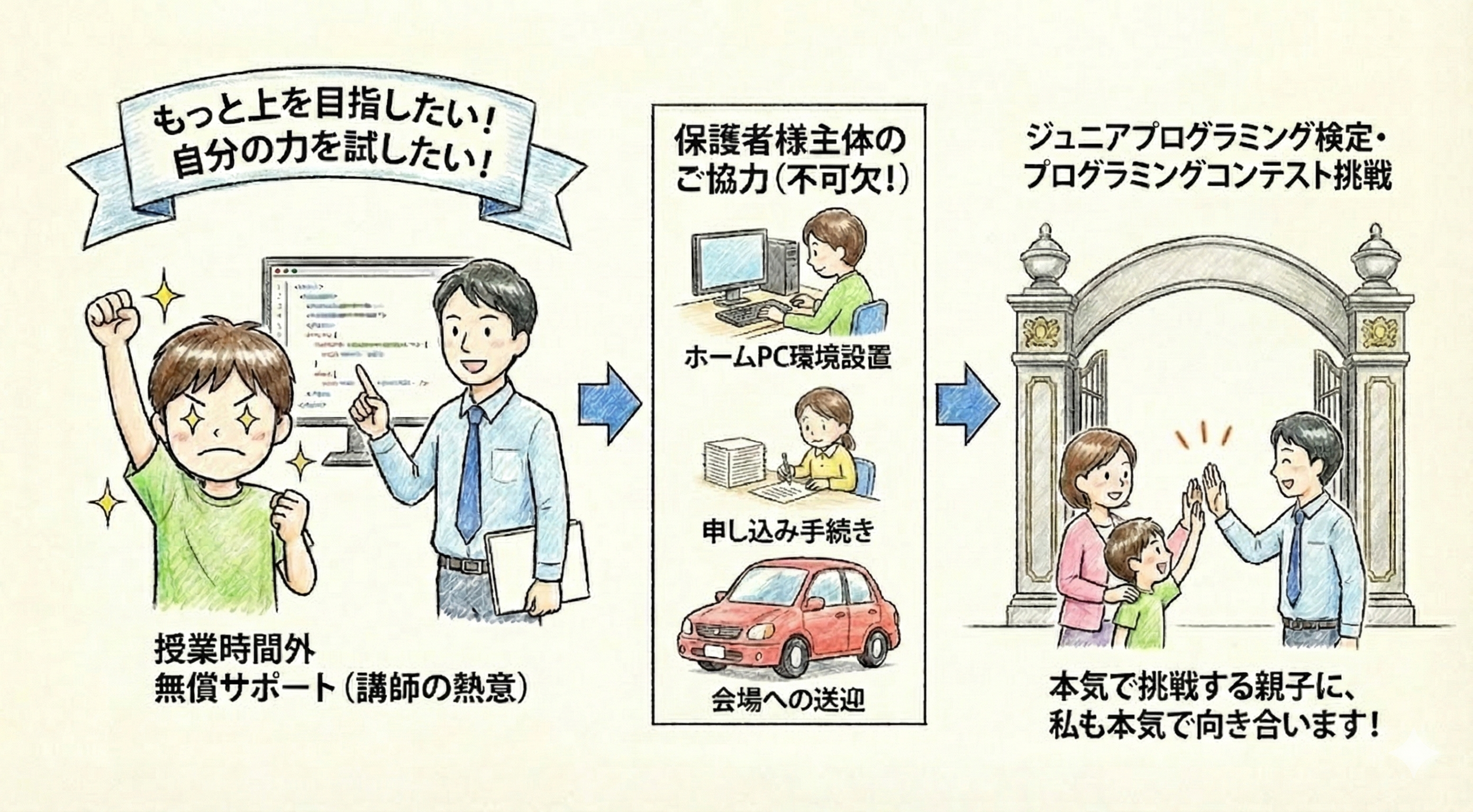 そのため、挑戦には保護者様主体でのご協力(ご自宅での環境構築、申し込み手続き、会場への送迎など)が不可欠となります。本気で挑戦する親子には、講師も本気で、とことん向き合います。