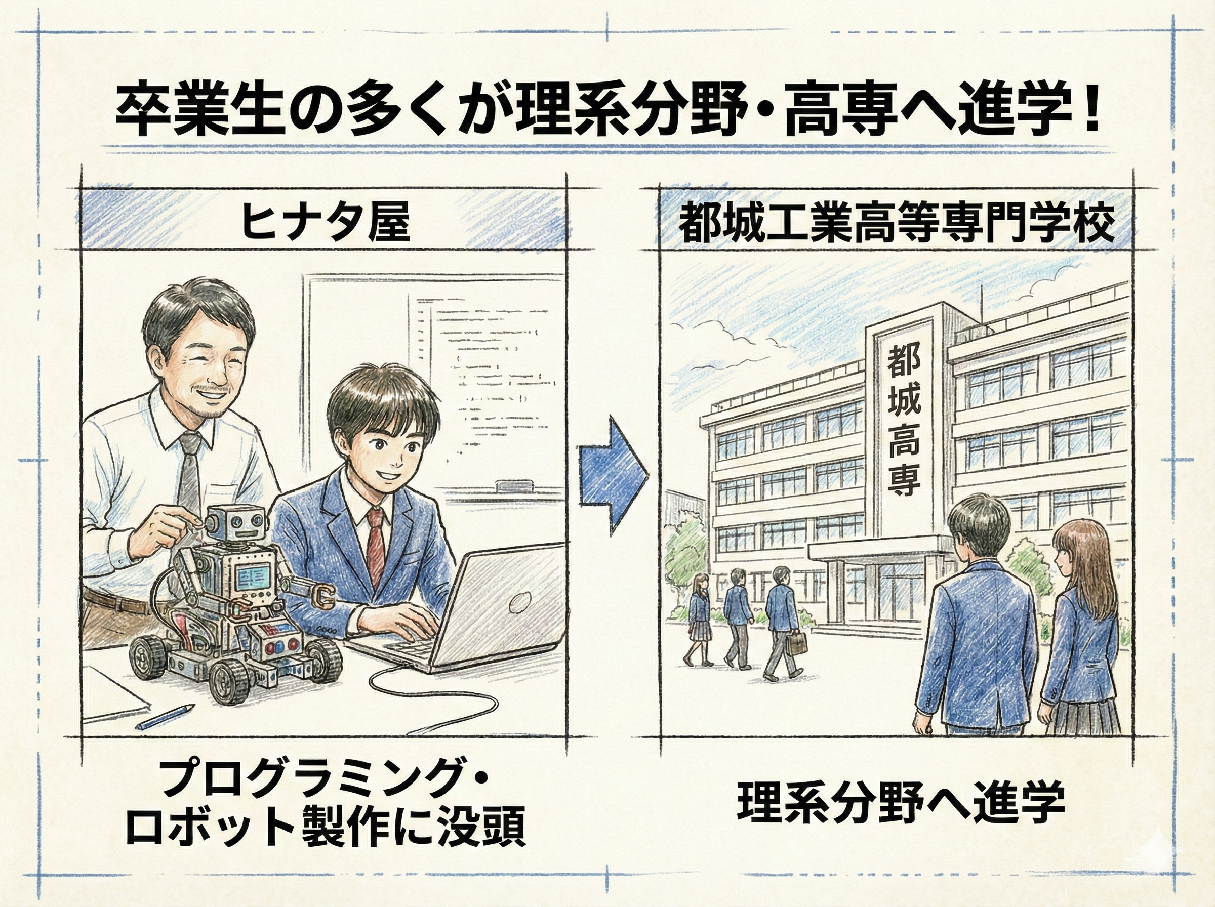 当教室の卒業生の多くは、講師の母校でもある「都城工業高等専門学校(高専)」をはじめとする理系分野へ進学しています。「プログラミング」や「ロボット製作」に没頭した経験は、推薦の面接でも強力な武器となります。